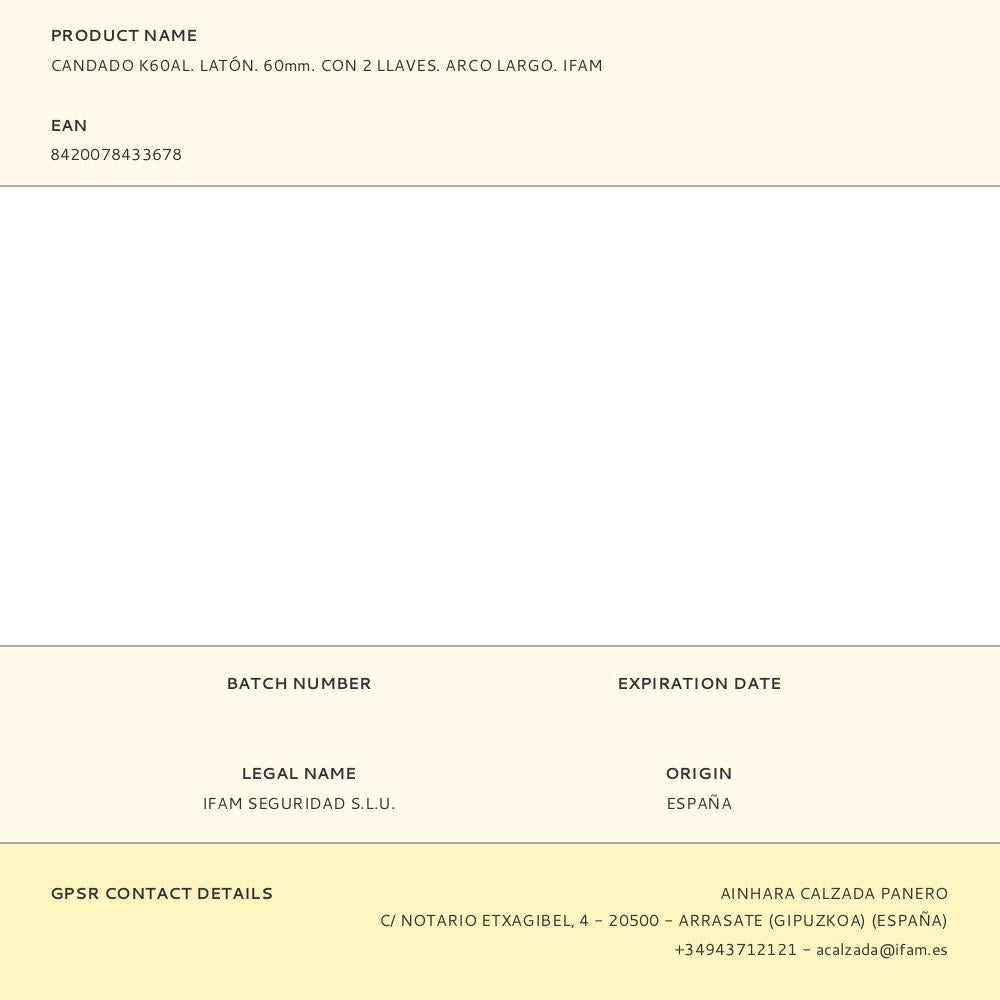 Cadeado k60al ifam. cadeado de latão serie k, 60mm, proporciona uma excelente e versátil solução de segurança, neste caso graças ao seu arco normal, caracteriza-se pelo seu corpo fabricado em latão e o seu arco fabricado em aço carbonitrurado e cromado. o seu sistema de abertura/fecho é automático de duplo enganche e com canhão de segurança anti-recolha. arco comprido