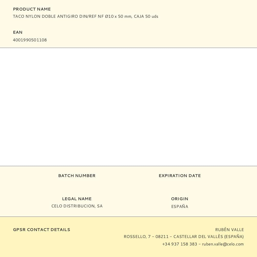 CAIXA 50 UNID. BUCHA NYLON DUPLO ANTI-GIRO DIN/REF NF Ø10MM CELO