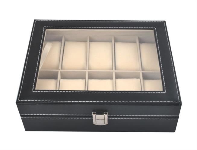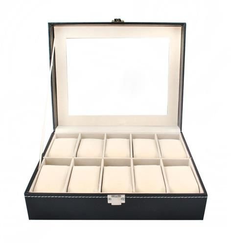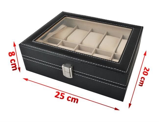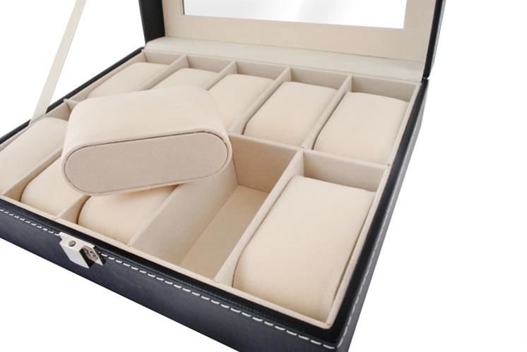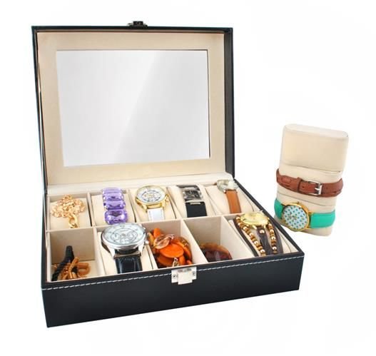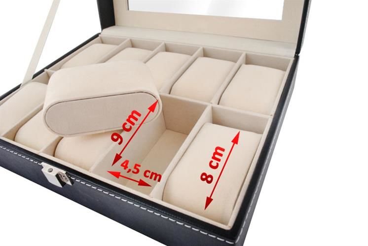 A elegante caixa para relógios possui 10 compartimentos nos quais pode colocar não só os relógios, mas também outras joias.