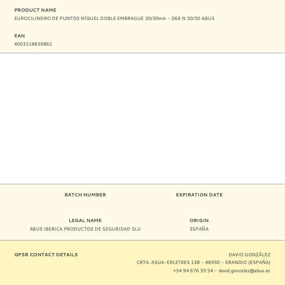 Cilindro perfil europeu chave pontos níquel e dupla embraiagem 30/30mm - d66 n 30/30mm abus. lingueta comprida. inclui 5 chaves de pontos, pode fazer cópias das mesmas, referência silca ab48 (edm ref.12028). cilindro para porta com chave de pontos reversíveis com rotura programada (pre-snap) e dupla embraiagem. cilindro duplo de perfil europeu.