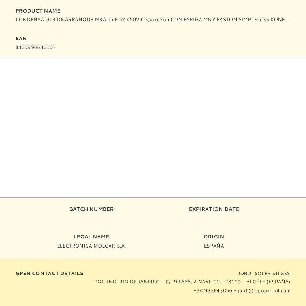 CONDENSADOR DE ARRANQUE MKA 1MF 5% 450V Ø3,4X6,3CM COM ROSCA M8 E