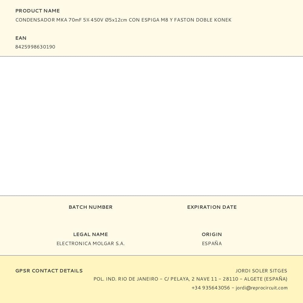 CONDENSADOR DE ARRANQUE MKA 70MF 5% 450V Ø5X12CM COM ROSCA M8 E F