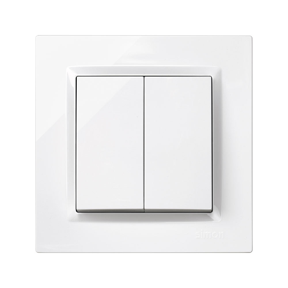 Interruptor duplo branco série 10. material plástico, ip20, 230v, 10ax. medida 8,4x4x8,4 cm. bloqueio 2,5cm. com quadro.