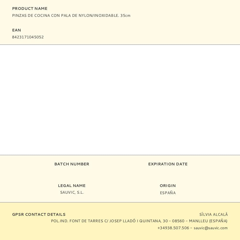 Pinças de cozinha com pá de nylon. material: aço inoxidavel/nylon. medida: 35cm (comprimento).