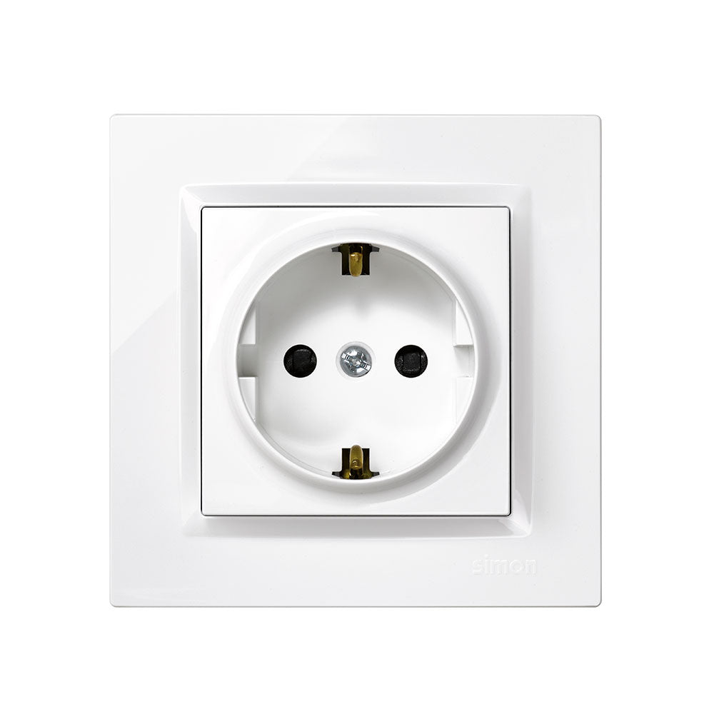 Ficha branca 2p+e tipo f com armação série 10, ip20, 230v, 16a. 2 pólos e terra. medida 8,4 x 3,5 x 8,4 cm., medida de bloqueio 2,5cm.