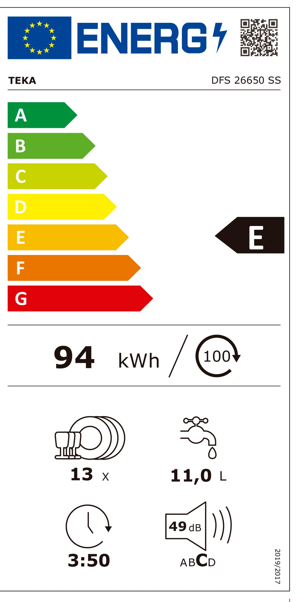 nCaracterísticasnn Lavavajillas libre instalacion n Programa de 1 hora - Extra Dryn Acero Inoxidable - Clase energetica E n Ancho 60 cm - Capacidad: 13 cubiertos n Panel de mandos electrónico con display digital LED blanco n Cinco temperaturas de lavado (45º50º55º60º65º) n Seis programas de lavado: 1 hora (58` lavado y secado), Eco, Normal (55º), Intensivo, Whisper (-2dB), GlassCare n Funciones: Media carga, Express, Secado extra, Start-Pause n Programación digital diferida (1-24 horas) n Bloqueo de seguridad para niños n Tecnología Eco3 Plus n Sistema de seguridad AQUASAFE n Posibilidad de instalación en columna n Cesta superior regulable en altura n Cesta inferior FlexiSet2 con soportes abatibles n Cesta para cubiertos n Cuba mixta polinox n Pilotos indicativos de funcionamiento, falta de sal, abrillantador, programa seleccionado y tiempo restante n Alarma óptica y acústica fin de programa n Clasificación energética: E n Consumo energía anual por 100 ciclos: 94 kWh100 ciclos n Consumo de agua por ciclo: 11 L n Programa estándar: ECO n Duración del ciclo estándar (minutos): 230 n Potencia sonora (dB): 49 n Dimensiones del aparato (alto x ancho x fondo): 845 x 598 x 600 n Función Extra Dry ExtraDry genera un calentamiento intenso durante el proceso de secado que minimiza notablemente los clásicos residuos de lavado ofreciendo un resultado perfecto y hasta un 30% más brillante. n Programa de 1 hora Los lavavajillas Teka cuentan con un programa especial de tan sólo 1 hora con lavado y secado incluido. Vajilla lista en un tiempo récord. n Programa Auto No cesamos de buscar la sencillez y la comodidad en cada paso. Con Autoprogram el lavavajillas reconoce automáticamente la cantidad y presión del agua según la suciedad, así como la temperatura idónea para unos resultados perfectos.nn