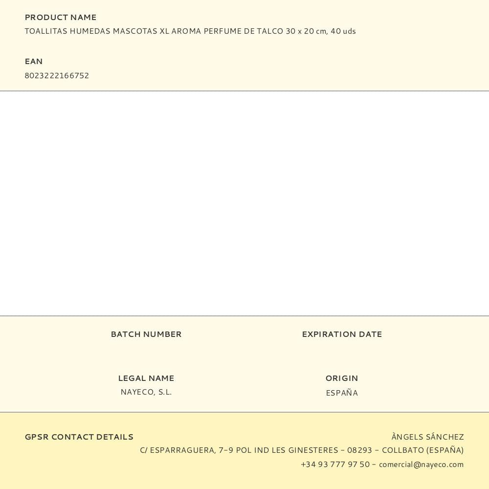 Toalhitas xl lenços húmido aroma talc perfume 40 unid. (30x20cm) fragrância de longa duração. tecido de relevo para uma limpeza mais eficiente e maior absorção. fechamento aberto/fechado que mantém a umidade. sem álcool. adequado para cães, gatos e filhotes. brânquias