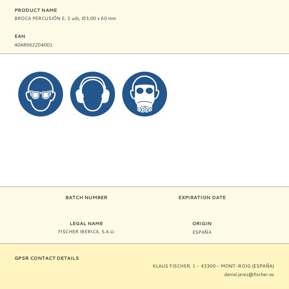 Broca de percussão e para betão com ponta de carbeto, 2 unid, ø3,00 x 60 mm