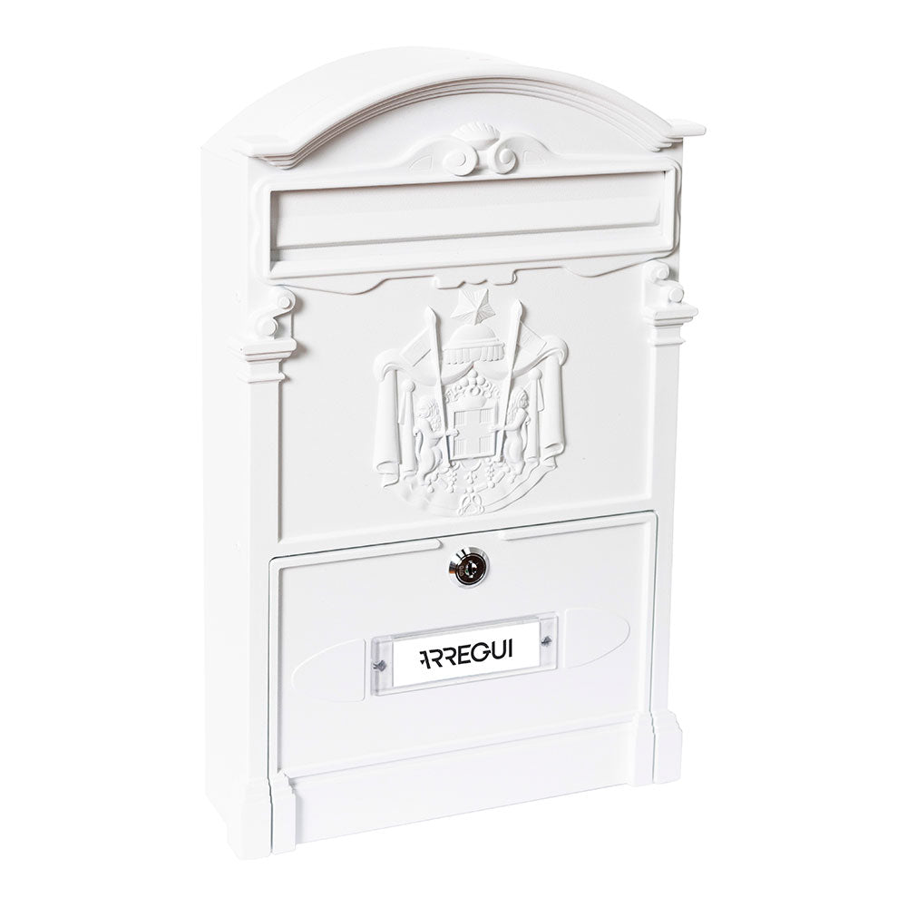 Buzón individual para exterior tamaño m (a4), corpo de alumínio e parte traseira de aço galvanizado, envernizado branco boca com mola para que esteja sempre fechada, símbolo heráldico frontal abertura de porta vertical inclui porta-cartões, duas chaves e parafusos resistente aos raios uv medidas: boca 22 x 3,5 cm, exterior 26 x 9 x 42 cm