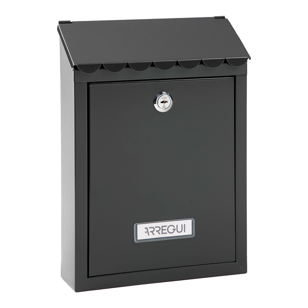 Caixa de correio individual para exterior tamanho s (a5), aço galvanizado lacado preto. tampa superior em forma de telhado que oculta a boca e a protege da água da chuva abertura de porta lateral inclui suporte para cartões, duas chaves e parafusos resistente aos raios uv medidas: boca 17,5 x 2 cm, exterior 21,6 x 8 x 30 cm