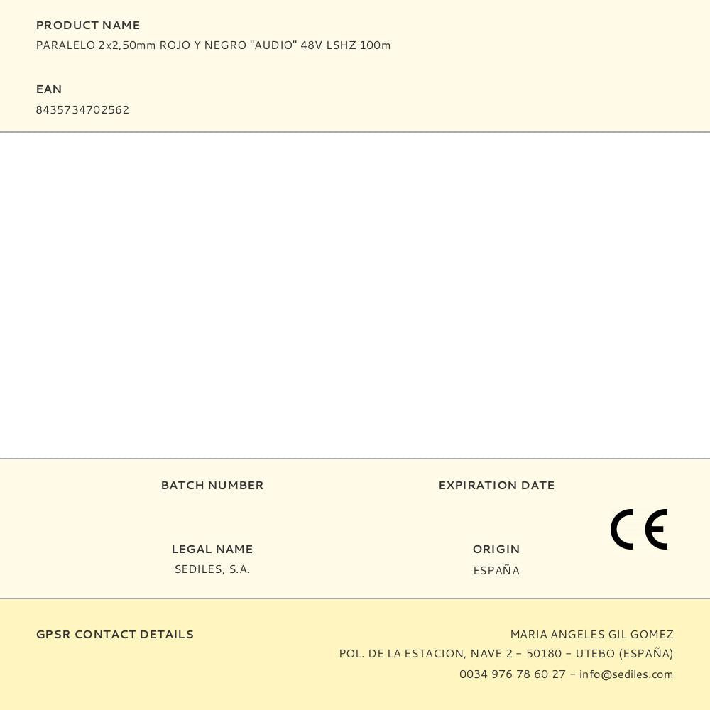 Paralelo 2x2,5mm vermelho e preto 48v lshz 100m livre de halogêneos.uso: instalações de áudio públicas.