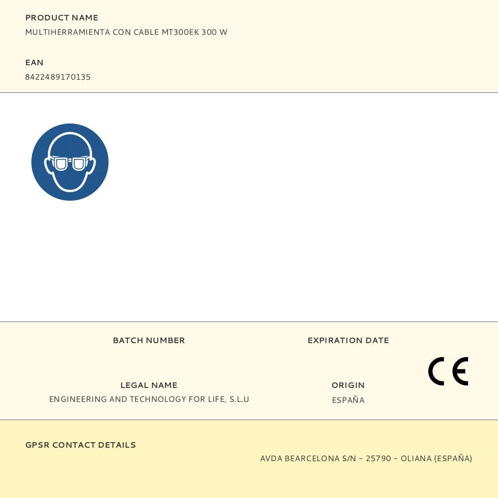 Multiferramenta com fio. potência de 300 w 230-240 v, velocidade variável 15000-22000 rpm. oscilação de 2,8°. acessórios incluídos: 3 lixas, 1 adaptador de acessórios, 1 raspador rígido, 1 serra para madeira e metal e 1 chave allen