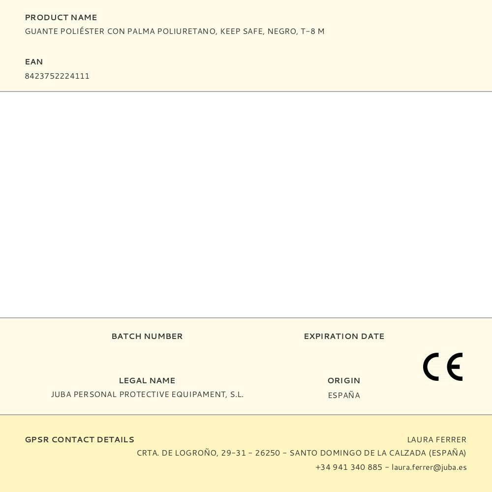 Luva de poliéster keep safe com palma em pu preto. boa sensibilidade tátil, transpirante e flexível. recomendada para: projetos de bricolagem, trabalho de campo, armazenagem e reposição de stock, manuseio, montagem e encaixe de peças em ambientes secos, levemente húmidos ou oleosos. t-8 m