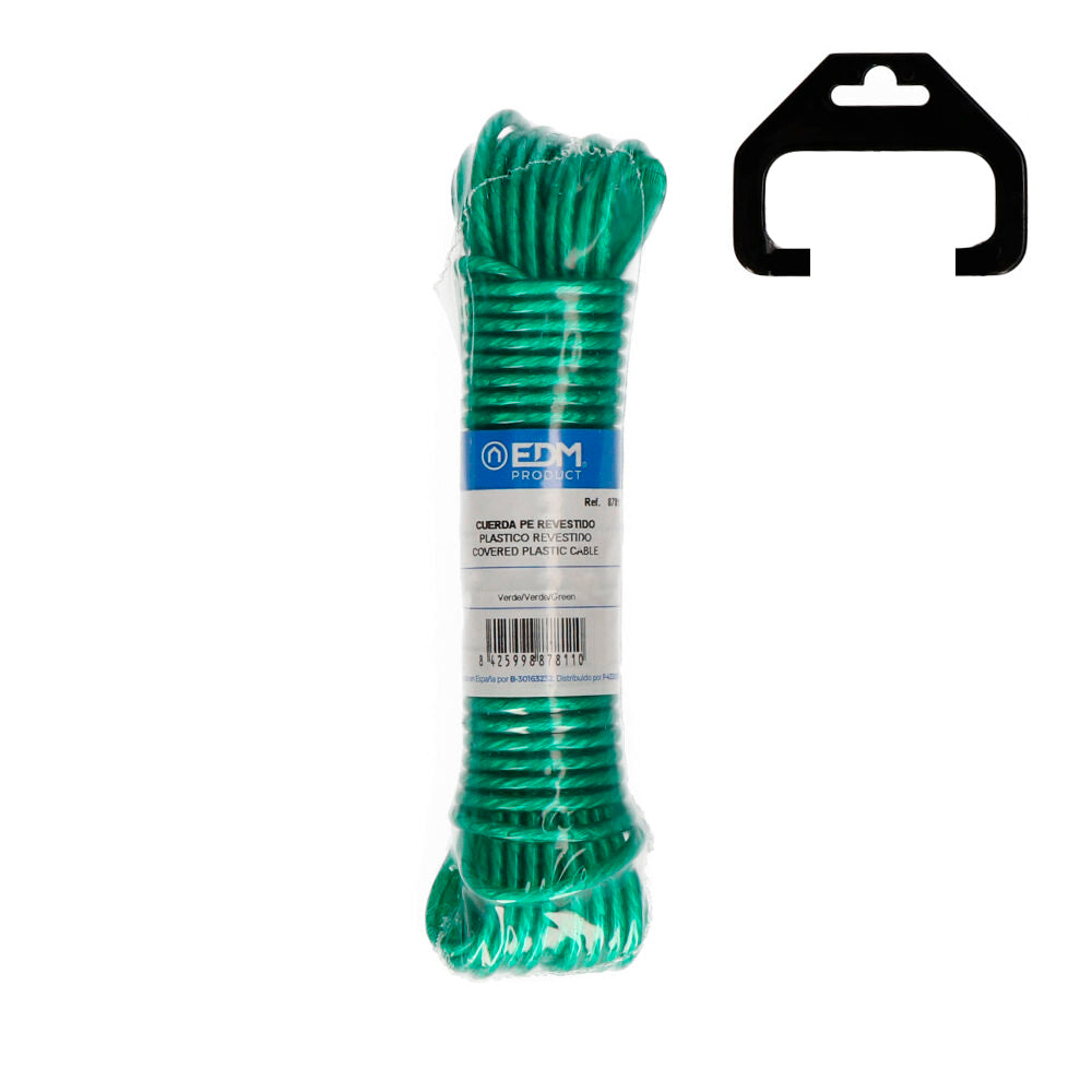 Corda plastico revestido 15 m verde. composição: mono filamento de polietileno torcido 3 cabos. recoberto de pvc. caracteristicas: suave, flexivel, boa resistência. pouca elasticidade. facil limpeza. utilidades: estendais exteriores e interiores, camping,nautica, cercados, agricultura, industria em geral, bricolagem