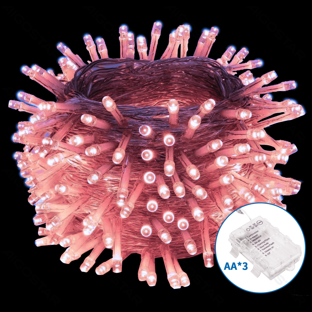 Cor do produto:Fio: transparenteCaixa da bateria: transparenteCor clara:Luz rosaTensáo:DC1.5V*3Descrição dos pontos de venda:100LED;10cmLED;8 funções + memória + temporizadorClassificação IP:IP44