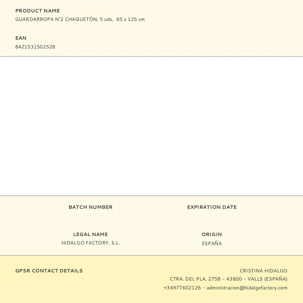5 sacos para arrumação n°2 casacos 65x125cm mauris. protege a roupa do pó, humidade e traças. 100% poliéster. produto espanhol