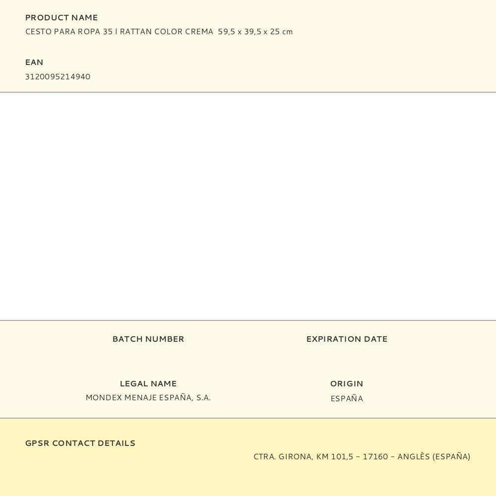 Cesto da roupa 35 l imitação vime / rattan cor creme. material: polipropileno. dimensões 59,5 x 39,5 x 25 cm