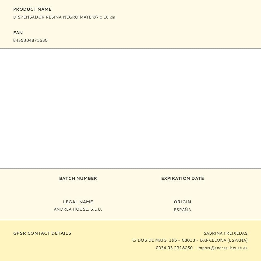 DISPENSADOR RESINA PRETO MATE Ø7X16CM ANDREA HOUSE