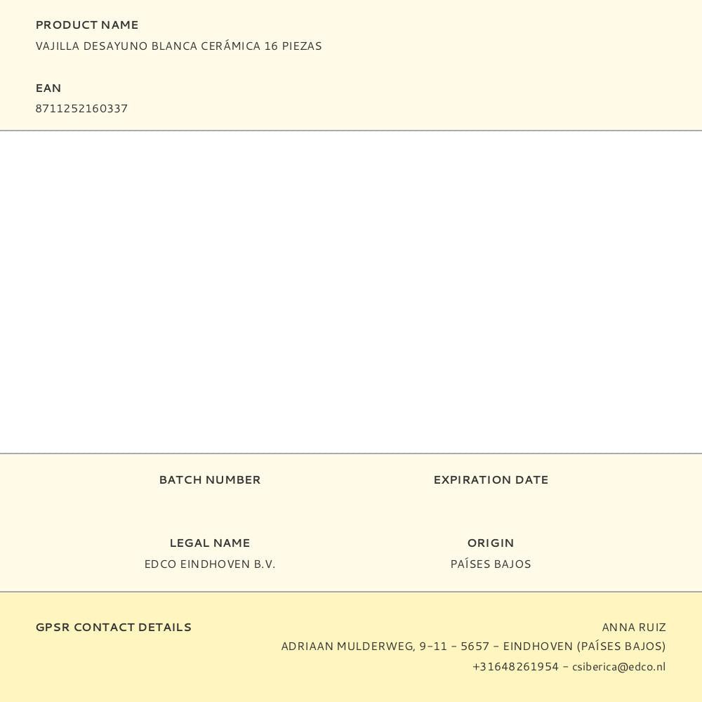 Serviço de louça de pequeno almoço em cerâmica branca com 16 peças, contém 4 pratos de pequeno-almoço de ø20,5 cm, 4 pratos de ø14,5 cm, 4 tigelas de ø15,5 cm e 4 chávenas de 170 ml, adequados para máquina lava-louça e micro-ondas.