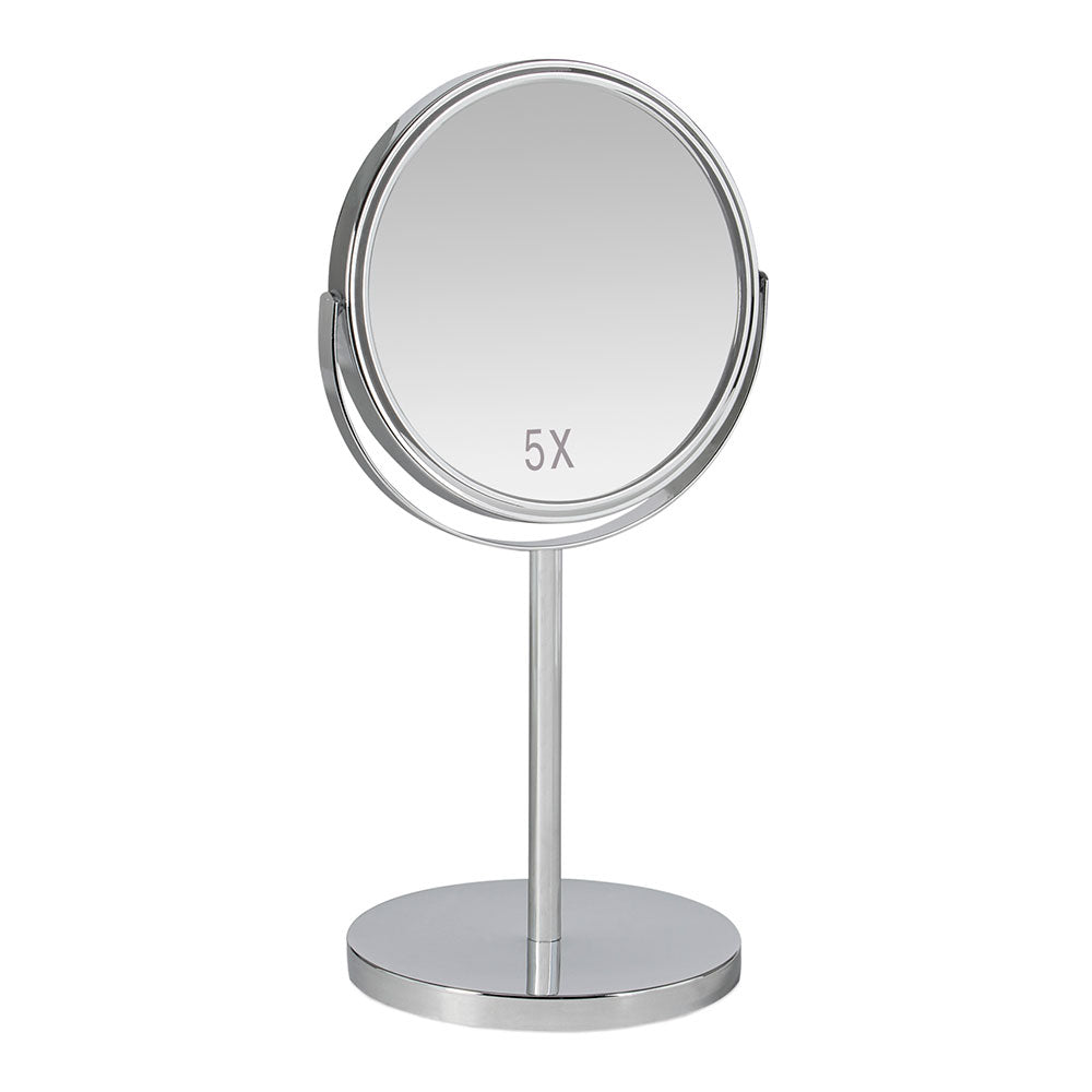 Espelho pé cromado x5au andrea house. espelho redondo 2 caras com pé. acabamento em metal cromado. caras de 1 aumenta e 5 aumentas. dimensões: 18,5x15x34,5cm