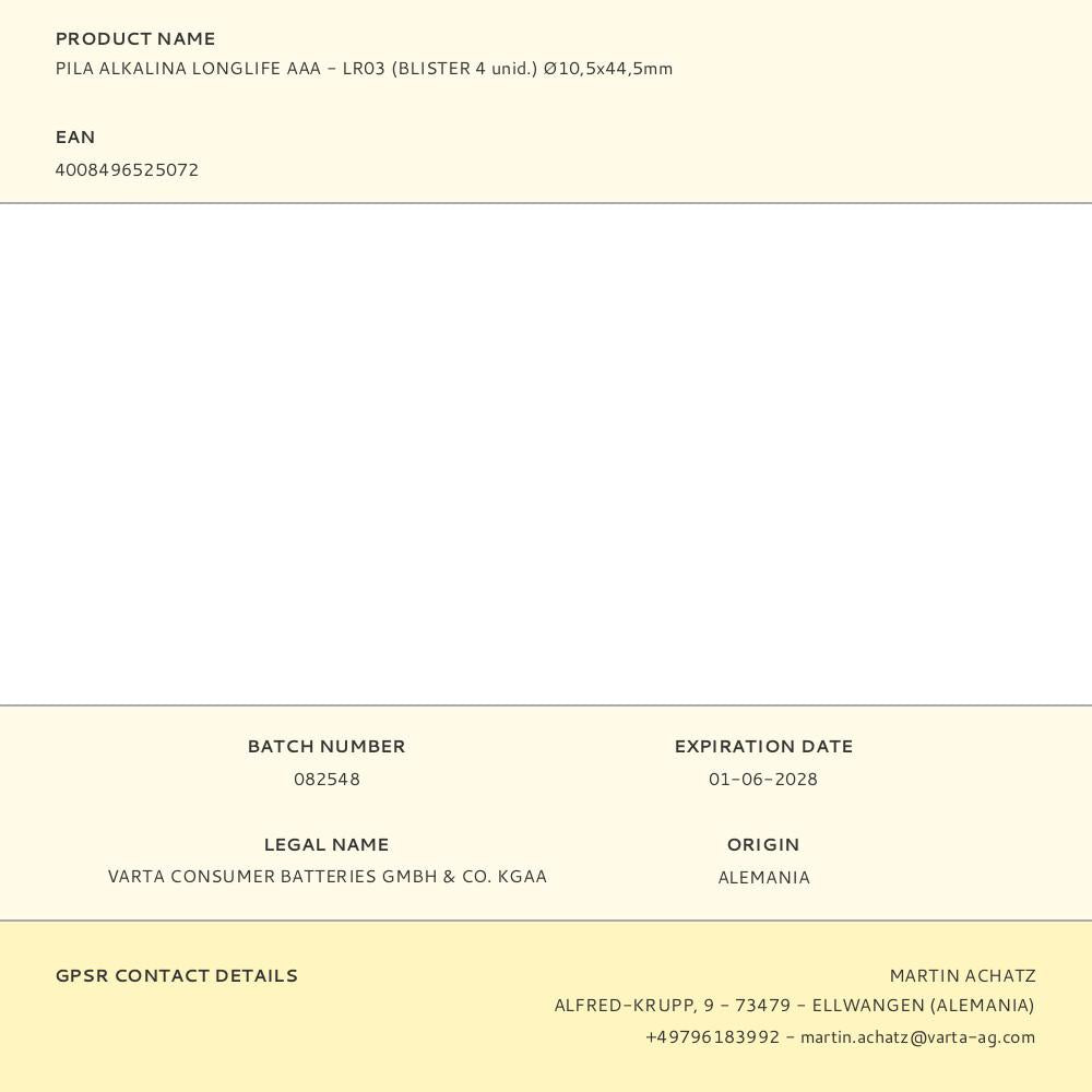 Varta 4103. Tipo de bateria: Bateria descartável, Tamanho da pilha: AAA, Tecnologia da bateria: Alcalino. Altura: 44,5 mm, Diâmetro: 1,05 cm, Peso: 11 g. Peso da embalagem: 49 g. Tamanho da embalagem: 80 x 12 x 120 mm, Factor de forma de bateria: Cilíndrico