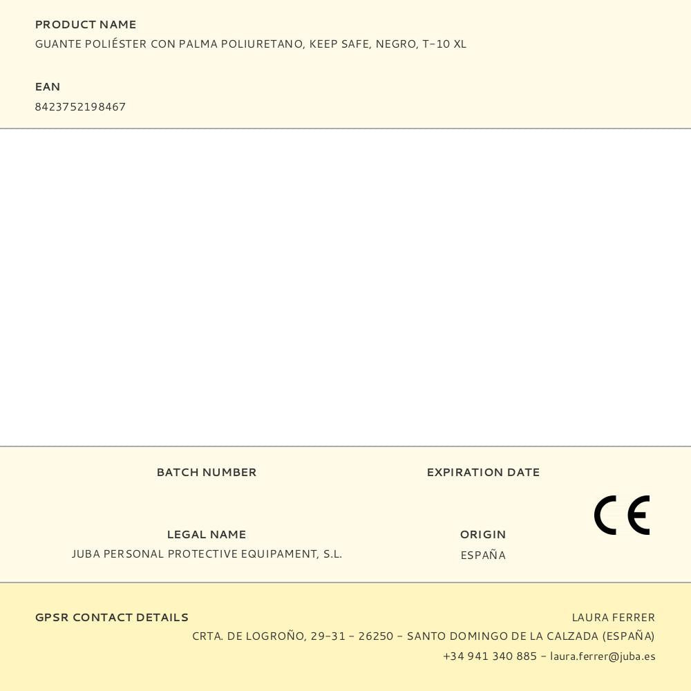 Luva keep safe em poliéster com palma em pu preto. boa sensibilidade tátil, transpirante e flexível. recomendada para: projetos de bricolagem, trabalho de campo, armazenagem e reposição de stock, manuseio, montagem e encaixe de peças em ambientes secos, levemente húmidos ou oleosos. t-10 xl