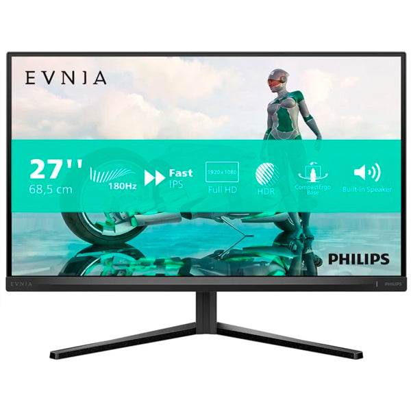 Philips Evnia 27M2N3200A00. Tamanho do ecrã na diagonal: 68,6 cm (27"), Resolução: 1920 x 1080 pixels, Tipo de HD: Full HD, Tecnologia de apresentação: LCD, Tempo de resposta: 1 ms, Proporção de imagem nativa: 16:9, ngulo de visão (horizontal): 178°, ngulo de visão (vertical): 178°. Altifalantes incorporados. Suporte VESA, Ajuste de altura. Cor do produto: Preto