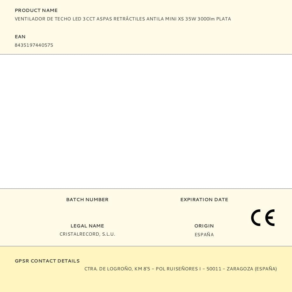 Ventoinha de tecto, prateado, led, 3 cct, modelo antila mini xs, ultra silencioso, com 3 pás de pc transparentes retráteis com motor cc, 35 w, ip20 db máx. 40. regulável, tipo de luz: quente 3000 k, dia 4000 k e fria 5700 k, 3000 lm, 6 velocidades. rpm máx. 530. função reversa inverno-verão, função brisa, temporizador de 2/4 h, memória aceso cct, luz noturna com comando e suporte de parede para comando incluídos (2 pilhas aaa não incluídas). fluxo de ar: máx. 6000 m³/h. vida útil: 20.000 h 220-240 v 50 hz, dimensões: com pás ø55 cm, aplique ø32 cm, altura 38 - 48 cm