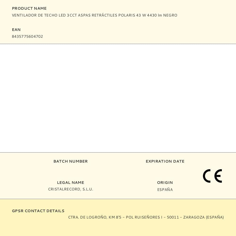 Ventilador de tecto, preto, 3 leds, modelo polaris, silencioso, com 3 pás retráteis em pc transparente com motor cc, 43 w, ip20 máx. db 39. tipo de lâmpada: luz quente 3000 k, luz do dia 4000 k, luz fria 5700 k, 4430 lm, 6 velocidades. função reversa inverno-verão, função brisa, temporizador de 1/2/4 h, memória do interruptor cct, luz noturna com controlo remoto e suporte de parede para controlo remoto incluídos (2 pilhas aa não incluídas). fluxo de ar: máx. 5730 m³/h. vida útil: 20.000 h. 220-240 v 50 hz, dimensões: com lâminas ø106 cm, tecto ø48,5 cm, altura 32 - 42 cm