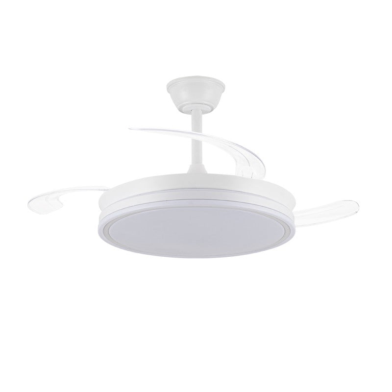Ventoinha de tecto, branco, led, 3 cct, modelo evo smart, silencioso, com 3 pás de abs transparentes retráteis com motor dc, 72w, ip20 db máx. 43. regulável, tipo de luz: quente 3000 k, dia 4000 k e fria 5700 k, 7920lm, 6 velocidades. rpm máx. 268. função reversa inverno-verão, função brisa, temporizador de 1/2/4 h, memória aceso cct, luz noturna com comando e suporte de parede para comando incluídos (2 pilhas aaa não incluídas) ou com o seu smartphone mediante app smart descarregar com qr. fluxo de ar: máx. 6580 m³/h. vida útil: 20.000 h 220-240 v 50 hz, dimensões: com pás ø106 cm, aplique ø48,5 cm, altura 32 - 42 cm