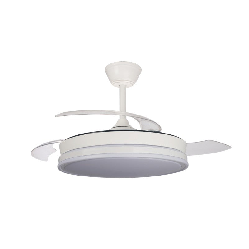 Ventoinha de teto led branco de 3 cct, modelo supereco, silencioso, com 3 pás retráteis em abs transparente com motor cc, 45 w, ip20 máx. db 37,8. regulável, tipo de luz: quente 3000 k, dia 4000 k e fria 5700 k, 4400 lm, 6 velocidades. rpm máx. 245. função reversa inverno-verão, função brisa, temporizador de 1/2/4 h, memória aceso luz noturna com comando e suporte de parede para comando incluídos (2 pilhas aaa não incluídas). fluxo de ar: máx. 5730 m³/h. vida útil: 20.000 h, 220-240 v 50 hz, dimensões: com pás ø106 cm, aplique ø48,5 cm, altura 32 - 42 cm