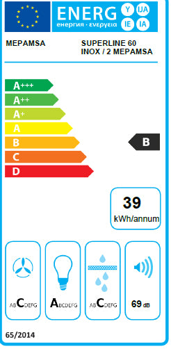 CARACTERÍSTICAS PRINCIPALES/nVER TODAS/nAncho 600/nNúmero de velocidades 2/nMáxima capacidad de extracción 380/nTipo de filtro de grasa Aluminio/nNivel de ruido (baja velocidad) 54/nClase de eficiencia de energía B