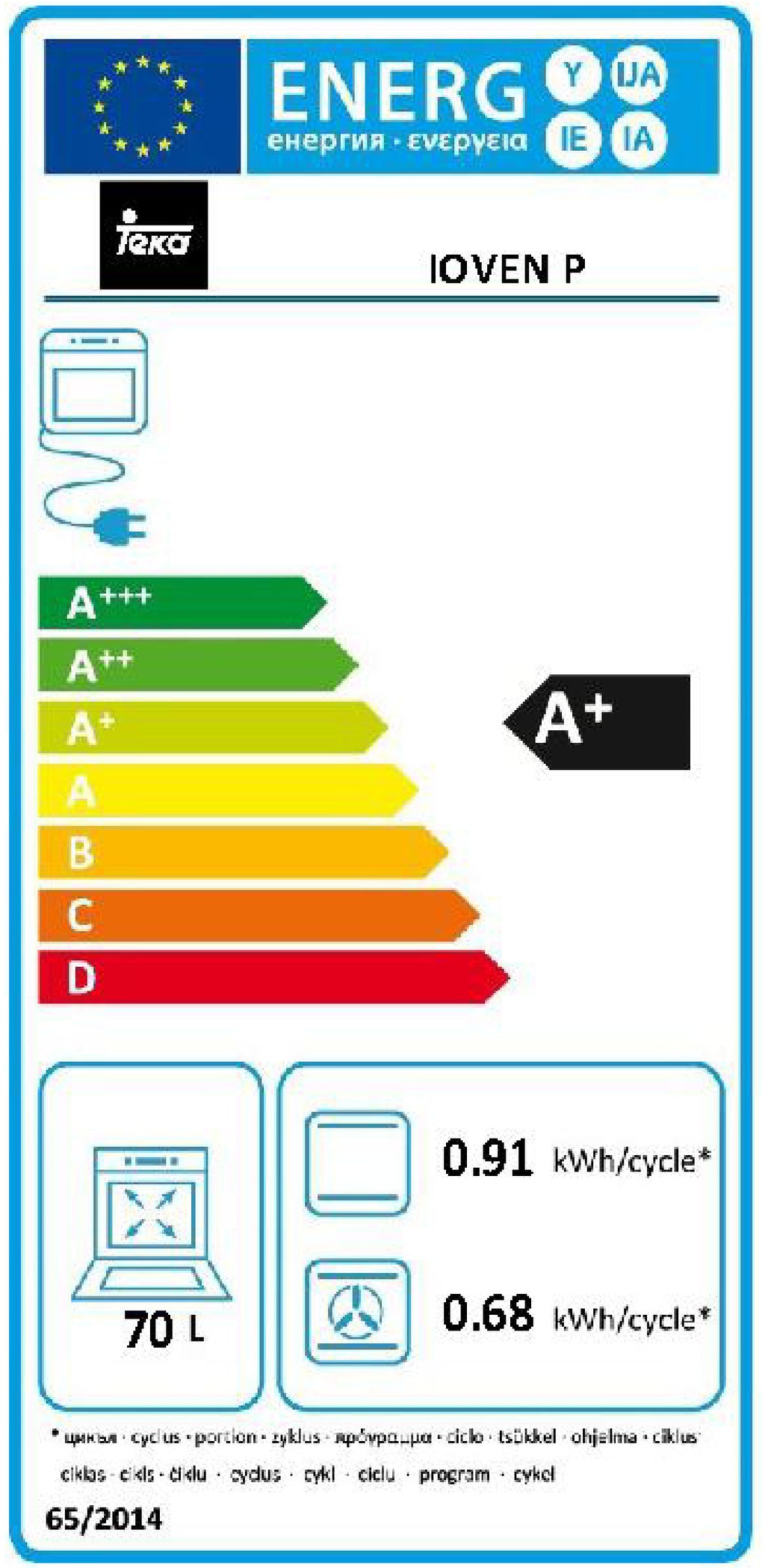 Teka IOVEN P. Tamanho do forno: Médio, Tipo de forno: Forno elétrico, Capacidade interior do(s) forno(s) totais: 70 l. Local de colocação: Embutido, Cor do produto: Preto, Aço inoxidável, Tipo de controlo: Toque. Classe de eficiência energética: A+, Consumo energético (convencional): 0,91 kWh, Consumo energético (convecção forçada): 0,68 kWh. Potência das lâmpadas: 25 W. Largura do compartimento de instalação: 58 cm, Altura do compartimento de instalação: 59 cm, Largura: 595 mm