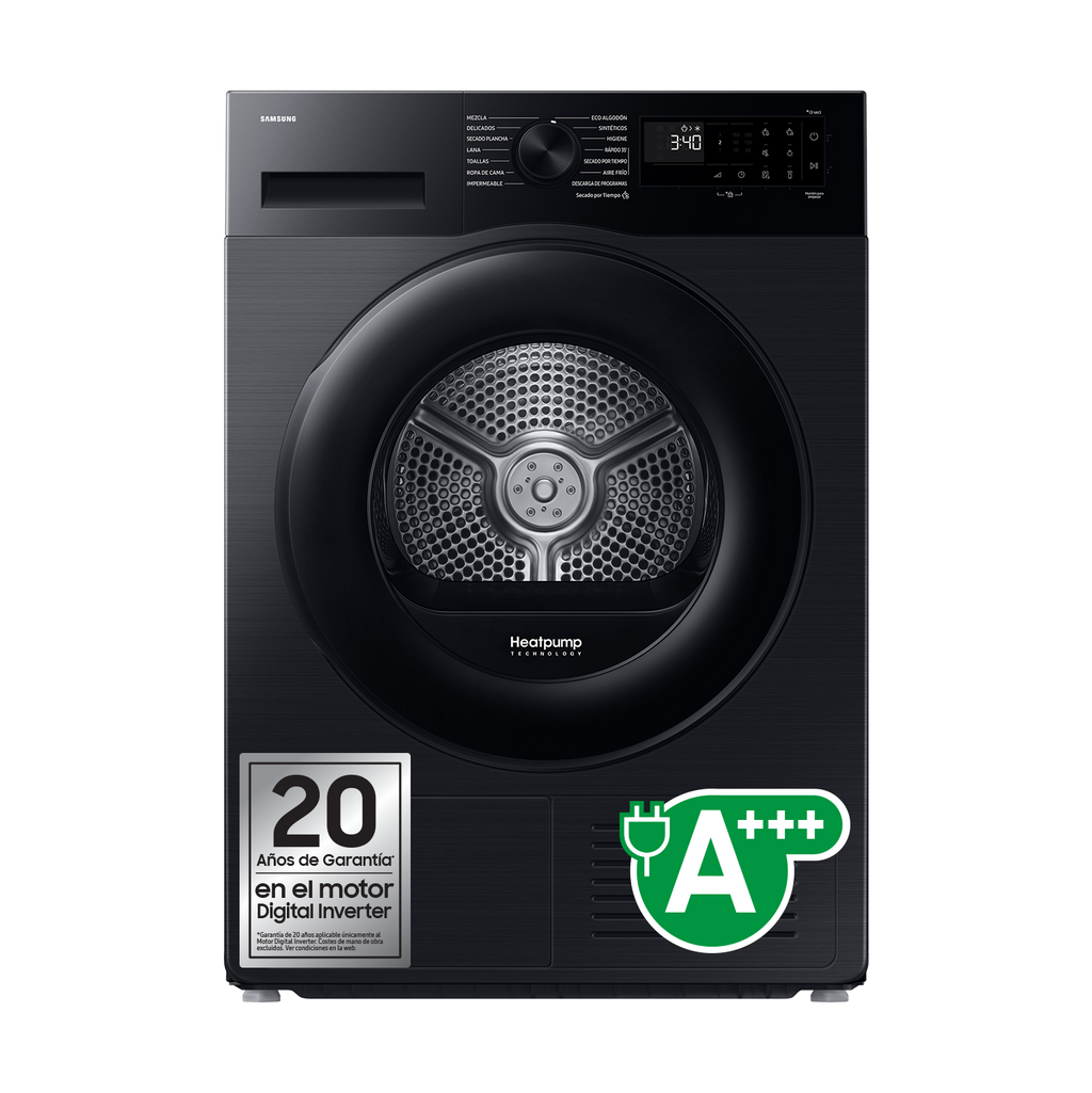 CARACTERÍSTICAS PRINCIPALES/nVER TODAS/nColor del producto Negro/nCantidad de programas de secado 14/nNivel de ruido 65/nSistema de secado Bomba de calor/nPantalla incorporada Sí/nCapacidad de secado 9/nMotor inverter Sí/nProgramas de secado Alfombra, Algodón, Delicado/seda, Cuidado fácil, Eco, Secado de plancha, Almohada, Rápido, Toalla