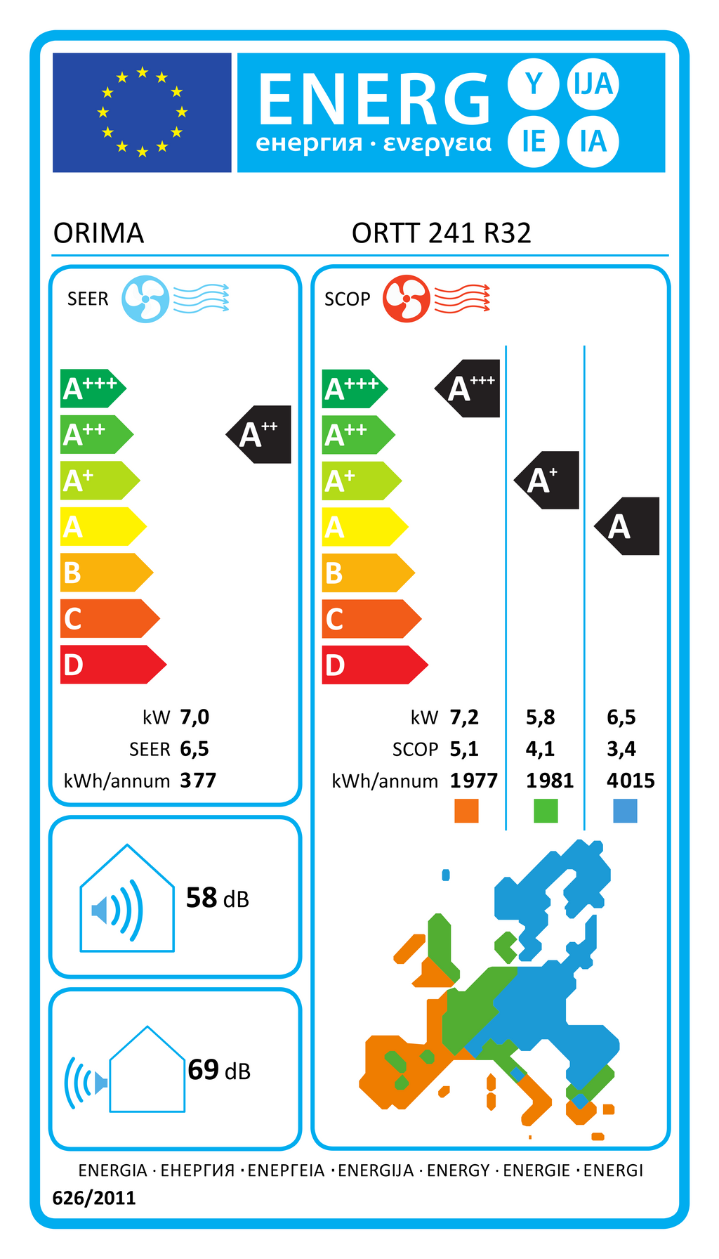Função arrefecimento e aquecimento< br> Função desumidificador e anti-humidade< br> Alta eficiência energética< br> Refrigerante R32< br> LED com indicação da temperatura< br> Modo de funcionamento noturno< br> Controlo remoto com visor LED< br> Filtro de carvão< br> Kit de montagem com 3 m< br> < br> Modo Frio< br> SEER - Eficiência sazonal em arrefecimento: 6.5< br> Eficiência energética: A++< br> Capacidade nominal de arrefecimento: 7.0 kW< br> Consumo anual de energia: 370 kWhano< br> Caudal de ar: 1100 m3h< br> < br> Modo Quente< br> SCOP - Coeficiente de rendimento sazonal (em aquecimento): 4,1< br> Eficiência energética: A+< br> Capacidade de aquecimento: 5.8 kW< br> Consumo anual de energia: 1981 kWhano< br> Caudal de ar: 1100 m3h< br> < br> NÃvel de RuÃdo da unidade interior: 58 dB< br> NÃvel de RuÃdo da unidade exterior: 69 dB< br> < br> Dimensões:< br> Unidade Interior: A333xL1100xP222 mm< br> Unidade Exterior: A699xL920xP380mm< br> < br> < br> < br> < br>