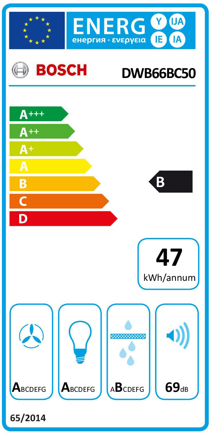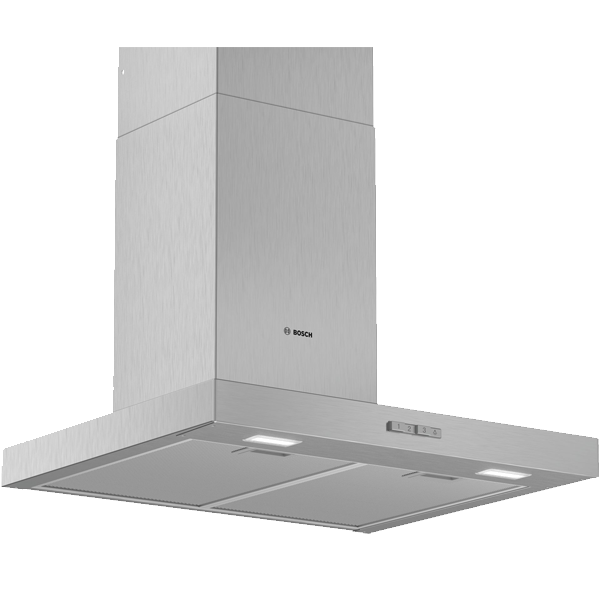 Bosch Serie 2 DWB66BC50. Potência máxima de extração: 590 m³/h, Tipo de extração: Conduzido, Classe Eficiência Dinâmica Fluídos: A. Tipo: Montado na parede, Cor do produto: Aço inoxidável, Material do corpo do produto: Aço inoxidável. Tipo de filtro de gordura: Alumínio. Potência das lâmpadas: 3 W, Número de lâmpadas: 2 lâmpada(s), Tipo da lâmpada: LED. Classe de eficiência energética: A, Consumo de energia anual: 44,2 kWh, Carga ligada: 220 W