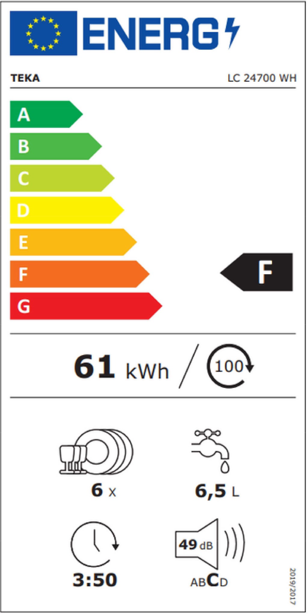 CARACTERÍSTICAS PRINCIPALES/nVER TODAS/nConsumo de agua por ciclo de lavado 6,5/nCapacidad 7 Servicios/nAncho (Real) 43,8 cm/nInicio retrasado 24/nProgramas de lavado Eco/nColor de la puerta Blanco/nClase de eficiencia de energía F