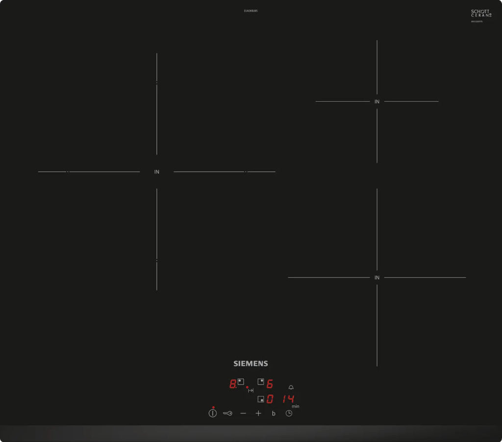 Siemens iQ100 EU63KBJB5E. Cor do produto: Preto, Local de colocação: Embutido, Largura do fogão: 60 cm. Tipo de controlo: Toque, Posição de controlo: Frente. Potência (elétrica ): 4600 W, Voltagem de entrada AC: 220 - 240 V, Consumo de energia: 175 Wh/kg. Tecnologias Siemens (cozinha): powerBoost. Largura: 592 mm, Profundidade: 522 mm, Altura: 51 mm