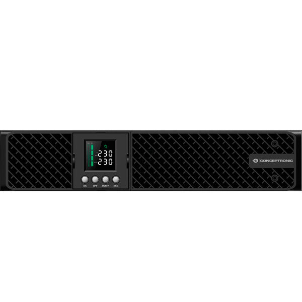 Conceptronic ZEUS51E1K. Topologia UPS: Dupla conversão (Online), Capacidade de energia de saída: 1 kVA, Potência de saída: 1000 W. Tipos de tomada AC: Acoplador C13, Quantidade de saídas AC: 8 tomada(s) CA, Tipo de porta USB: USB Type-B. Capacidade da bateria: 9 Ah, Voltagem da bateria: 12 V, Tempo de carga: 4 h. Forma: PC, Cor do produto: Preto, Tipo de refrigeração: Ativo. Largura: 438 mm, Profundidade: 430 mm, Altura: 88 mm