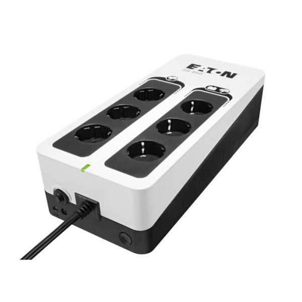 Eaton 3S450D. Topologia UPS: Em espera (Offline), Capacidade de energia de saída: 0,45 kVA, Potência de saída: 270 W. Quantidade de saídas AC: 6 tomada(s) CA. Tecnologia da bateria: Chumbo-ácido selado (VRLA). Cor do produto: Preto, Branco, Comprimento do cabo: 1,5 m, Segurança: IEC 62040-1; IEC 62040-2 C2; IEC 62040-3; IEC 62040-4; IEC 61643-11. Largura: 325 mm, Profundidade: 140 mm, Altura: 86 mm