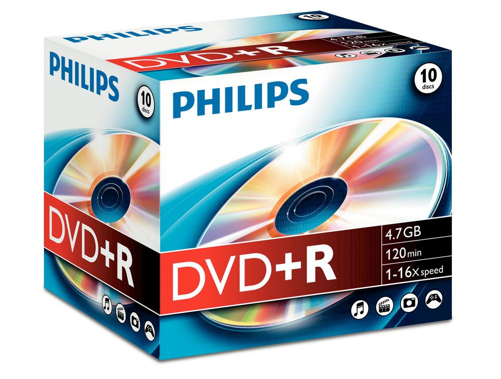 Philips DVD+R DR4S6J10C/10. Capacidade nativa: 4,7 GB, Tipo: DVD+R, Diâmetro de disco ótico: 120 mm. Velocidade de escrita DVD+R: 16x