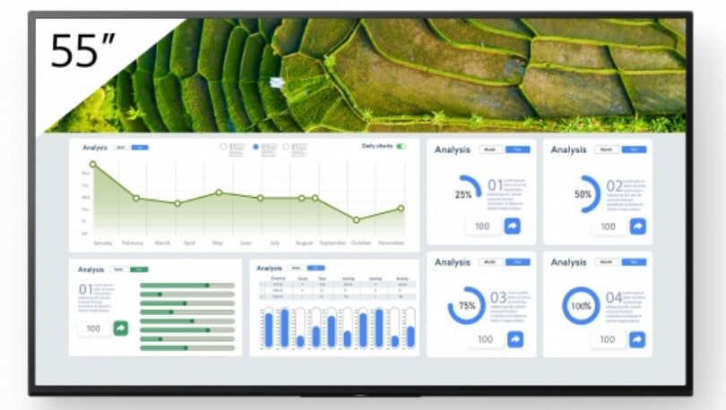 Sony FW-55BZ30L. Design de produto: Plasma digital. Tamanho do ecrã na diagonal: 139,7 cm (55"), Tecnologia de apresentação: LCD, Resolução: 3840 x 2160 pixels, Luminosidade: 440 cd/m², Tipo de HD: 4K Ultra HD. Wi-Fi. Tempo de funcionamento (horas/dias): 24/7. Sistema operativo instalado: Android. Cor do produto: Preto