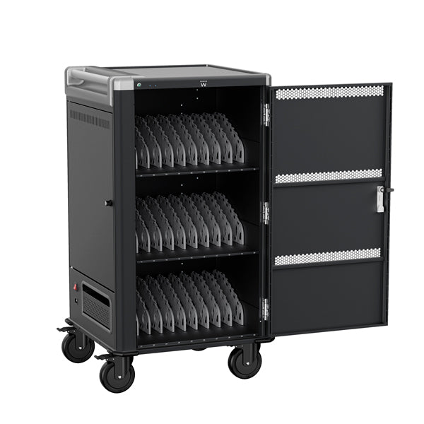 Ewent EW1700. Tipo: Carrinho de gestão de dispositivos portáteis, Cor do produto: Preto, Cinzento, Localização: Chão. Dispositivos portáteis compatíveis: Computador portátil, Tablet, Tamanho máximo de ecrã: 43,2 cm (17"), Tipo de fechadura: chave. Largura: 600 mm, Profundidade: 580 mm, Altura: 1127 mm. Cabos: AC