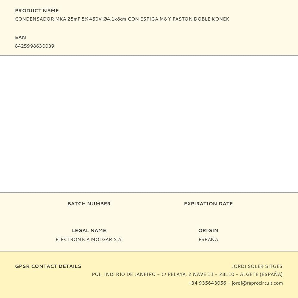 CONDENSADOR DE ARRANQUE MKA 25MF 5% 450V Ø4,1X8CM COM ROSCA M8 E