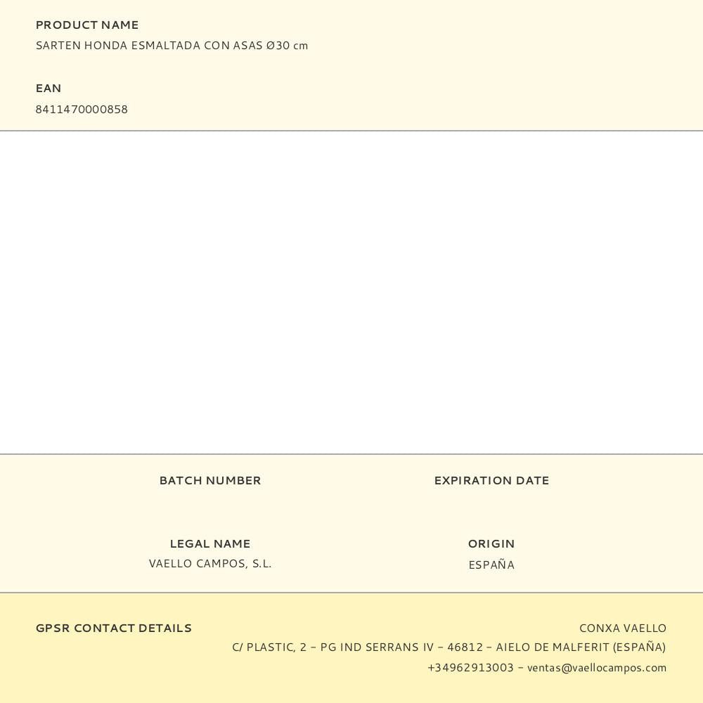 Frigideira funda esmaltada com pegas ø30cm. produto fabricado em aço laminado em frio e revestido com uma camada de esmalte antiácido. limpeza e manutenção simples. apta para forno. de 4 a 6 refeições. vaello