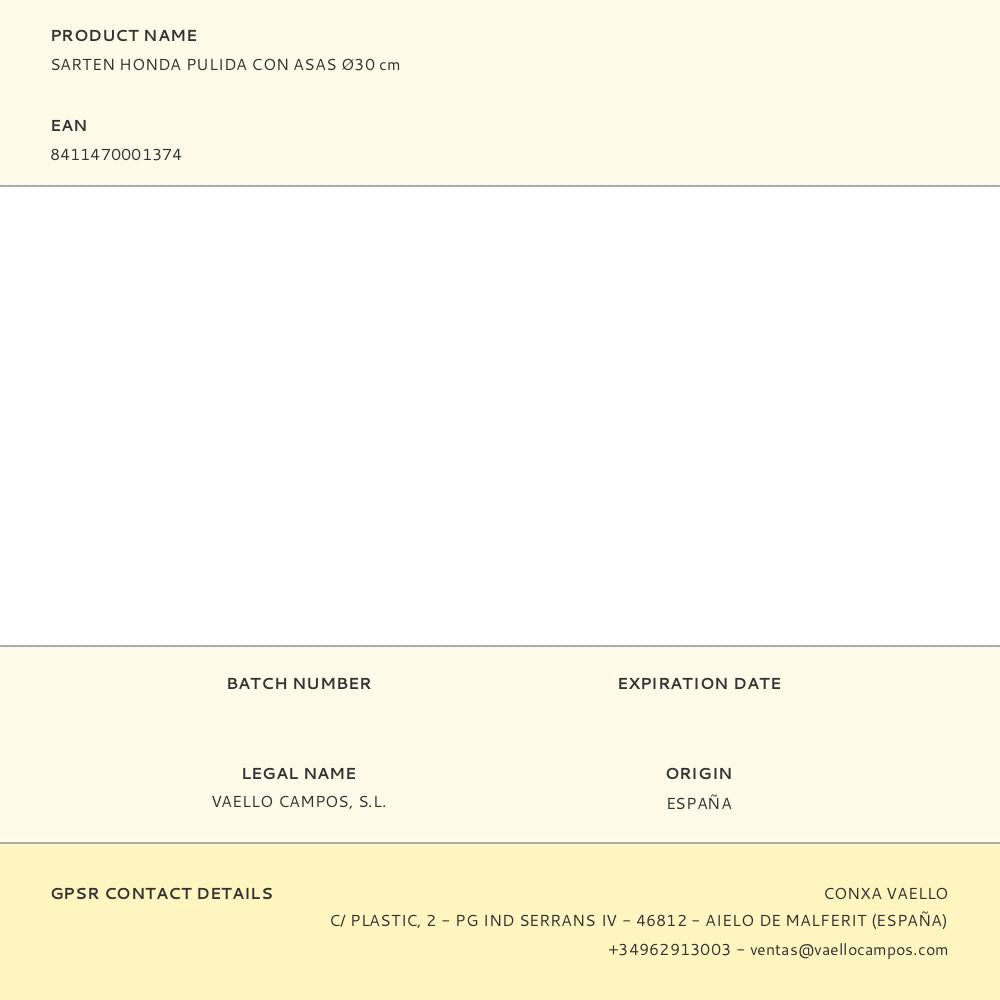 Frigideira funda polida com pegas ø30cm. produto fabricado em aço laminado em frio. indicado para fogo em chama ideais para refogar arroz e cozidos. de 4 a 6 refeições. vaello