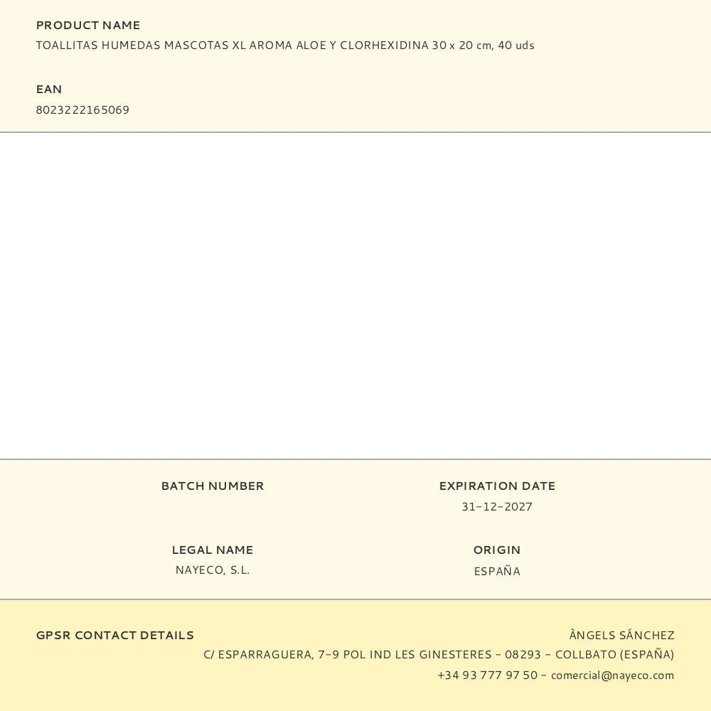 Lenços umedecidos tamanho xl para animais de estimação, 30 x 20 cm, pacote com 40 unidades, com fragrância de aloe vera e clorexidina. fragrância duradoura. tecido texturizado para uma limpeza mais eficaz e maior absorção. fecho que permite abrir e fechar para reter a umidade. sem álcool. adequado para cães, gatos e filhotes