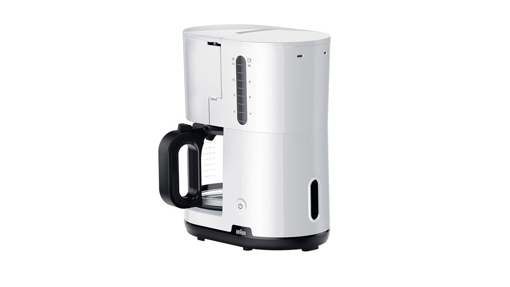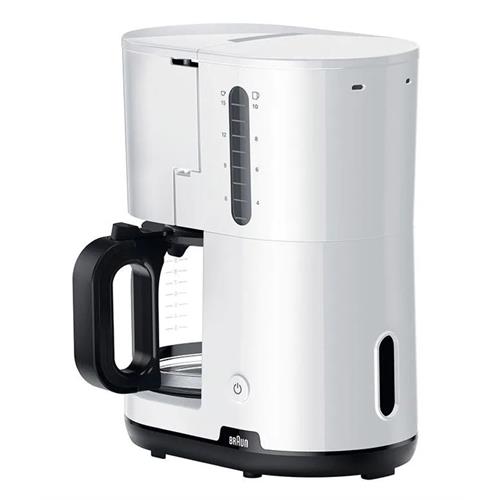 Braun KF1100. Tipo de produto: Cafeteira de filtro, Tipo de entrada de café: Café moído, Reservatório para café moído: Jarro, Capacidade em copos: 10 chávenas. Potência: 1000 W. Cor do produto: Preto, Branco