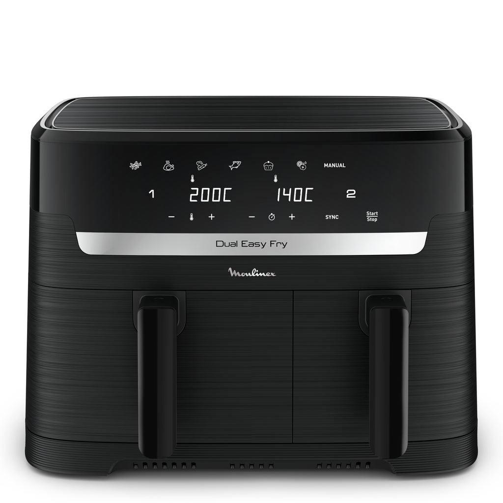 A fritadeira sem óleo Moulinex Dual Easy Fry EZ901N20 revoluciona a sua cozinha graças à sua capacidade de 8,3 L e aos seus 2 compartimentos independentes, ideais para cozinhar dois pratos diferentes ao mesmo tempo.