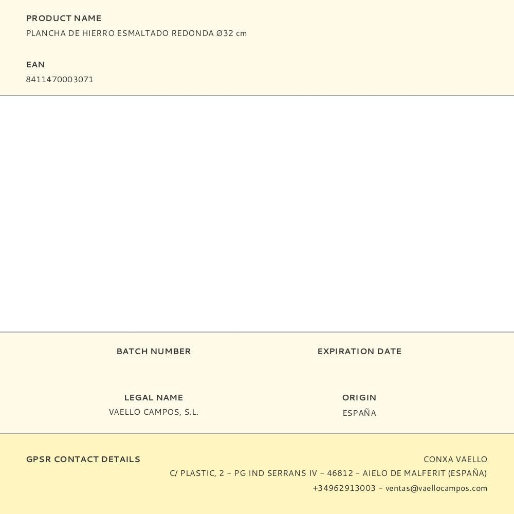 Grelhador de ferro esmaltado redondo ø32cm. vaello. as chapas de ferro esmaltado são ideais para uso ao ar livre, com fogo ou carvão. podem ser usados em ambos os lados. a parte dianteira contém nervuras e a traseira é lisa. vaello